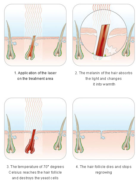 During the treatment laser impulses are delivered to the skin. The energy is transported through the hair deep into the roots, whereby they are permanently destroyed by the heat. Only pigmented hair can transport this energy further through the dye melanin found in the hair. Blond, red or grey hair cannot successfully used due to the missing coloration. The duration of treatment depends on the size of the area treated and lasts from just a few minutes for an upper lip treatment up to an hour for a treatment of a hirsute male.